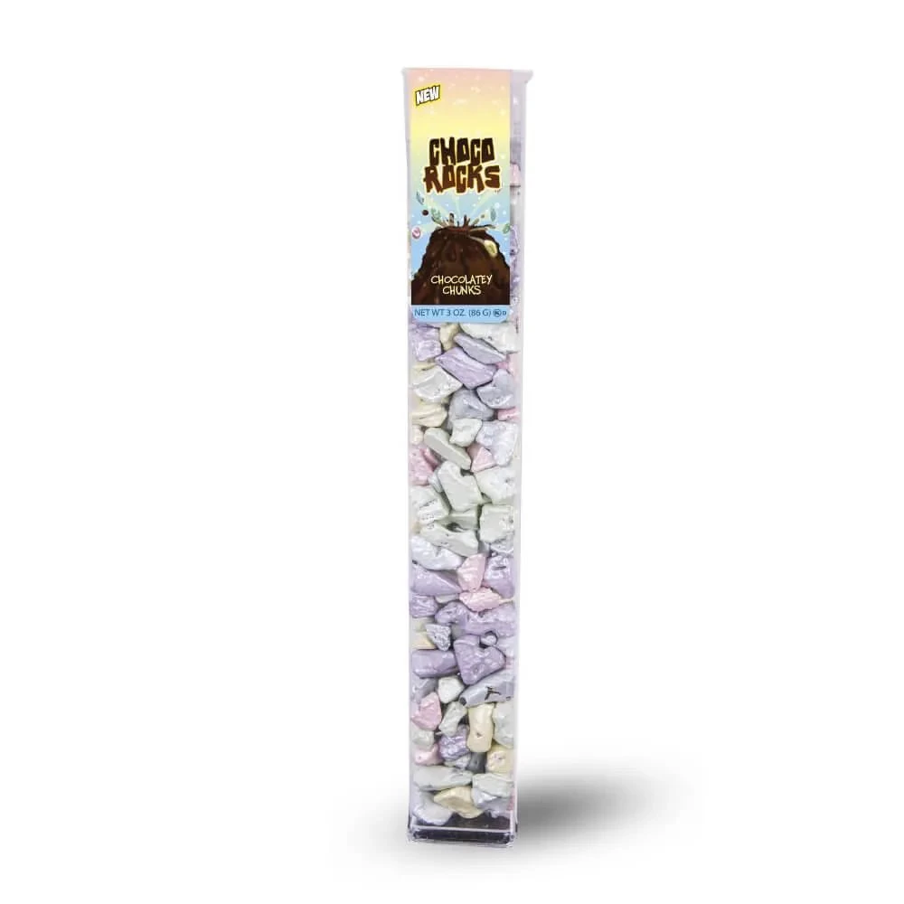 Tube contains 2.5 ounces of Choco Rocks Pastel Sparkle Mix Chocolate Rocks Candy.