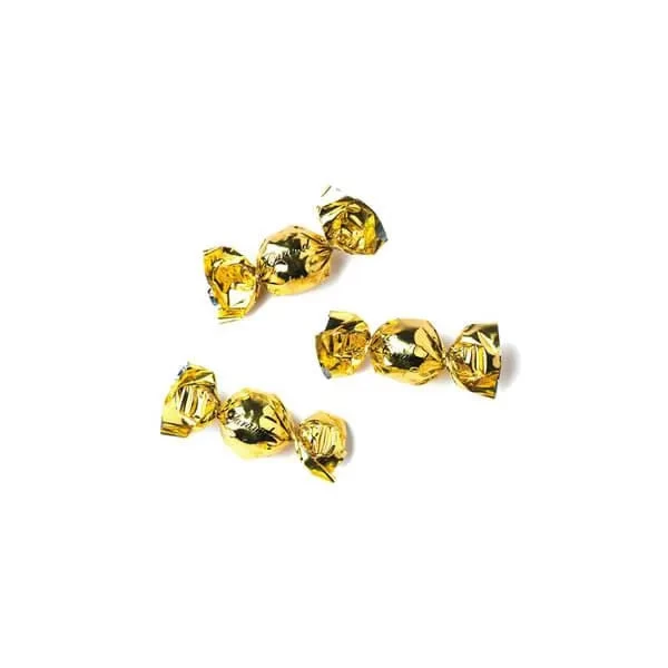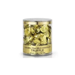 Acetate tub contains 30 pieces of Gold Foil Wrapped Caramel Filled Chocolate Truffles Candy.