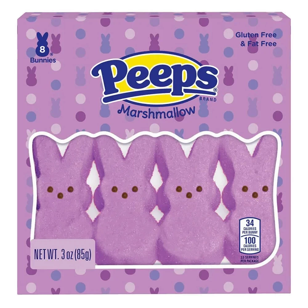 Pack contains 8 Lavender Peeps Marshmallow Bunnies.