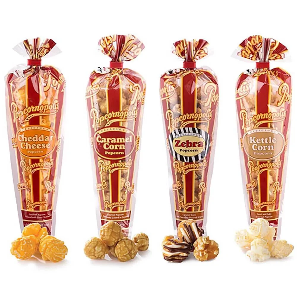 Make your party or event more fun with Popcornopolis Mini Cones stuffed full of delicious popcorn flavors. Experience the splendid balance of crunchy, savory, and sweet offered by these unique candied popcorn treats. Packed in an assortment of four recipes, Popcornopolis Mini Cones offer the snack size portions perfect for kids and adults alike. Simply arrange the cones in a large candy bowl and watch them quickly disappear as guests grab them from your dessert table!
