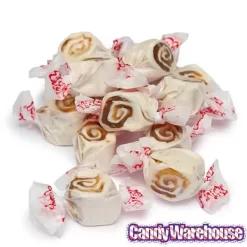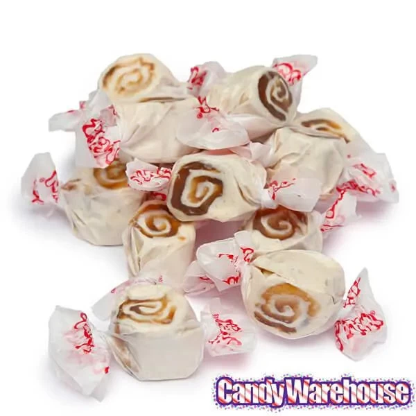 Bag contains 2.5 pounds of Gourmet Cinnamon Roll Salt Water Taffy Candy.