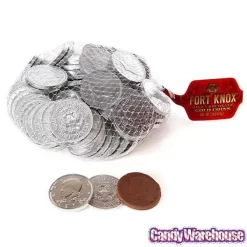 Mesh bag contains 1 pound of Fort Knox Silver Foiled Milk Chocolate Coins… that’s about 88 coins.