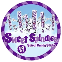 A spindle is a rod or capstan that revolves around an axis. Seen here is a colorful candy version of this elemental engineering masterpiece, crafted from purple and white spirals of hard candy and featuring a vibrant grape flavor! An excellent option for any purple themed candy bar design, Sweet Spindles offer sweet satisfaction in a compact form factor that fits snugly into a variety of glass candy jars. Take them for a spin at your next party or event!