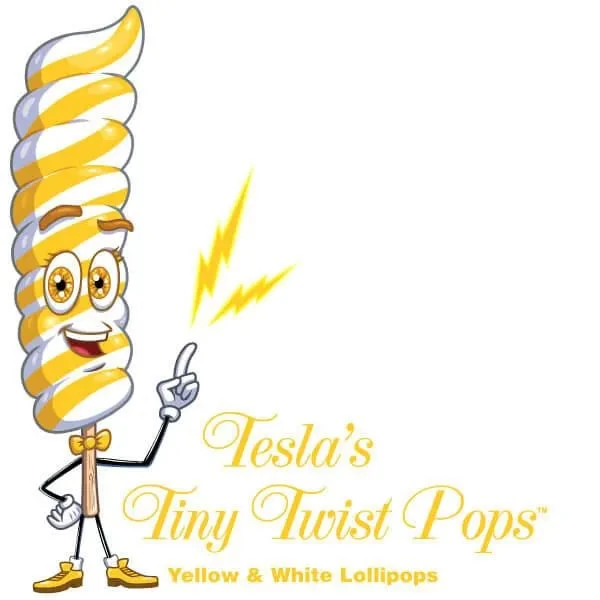 Tiny lollipop spirals of yellow and white hard candy featuring a delicious lemon flavor! Inspired by mad scientist Nikola Tesla’s induction coil, these minute marvels are engineered to transmit fabulous flavors with every twist and turn. Shockingly scrumptious, you won’t be able to resist the magnetic pull of their sweetness.